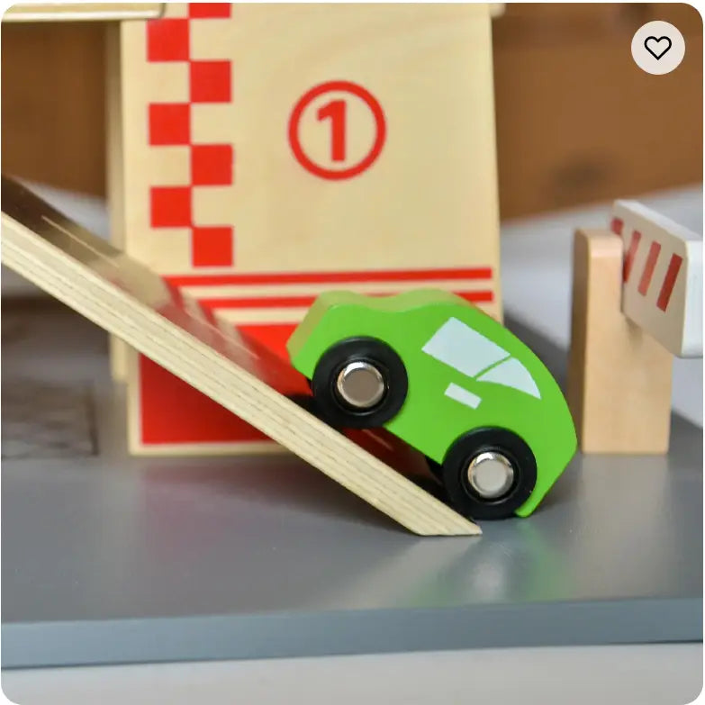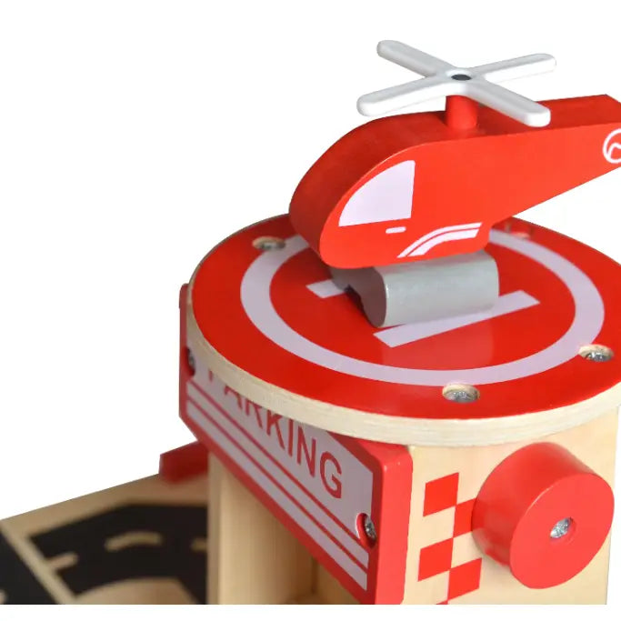 Our sturdy, high-quality wooden parking garage is built for endless imaginative play. Complete with colorful cars, a helicopter, removable slides, and adjustable barriers, this set offers hours of fun while encouraging important developmental skills.