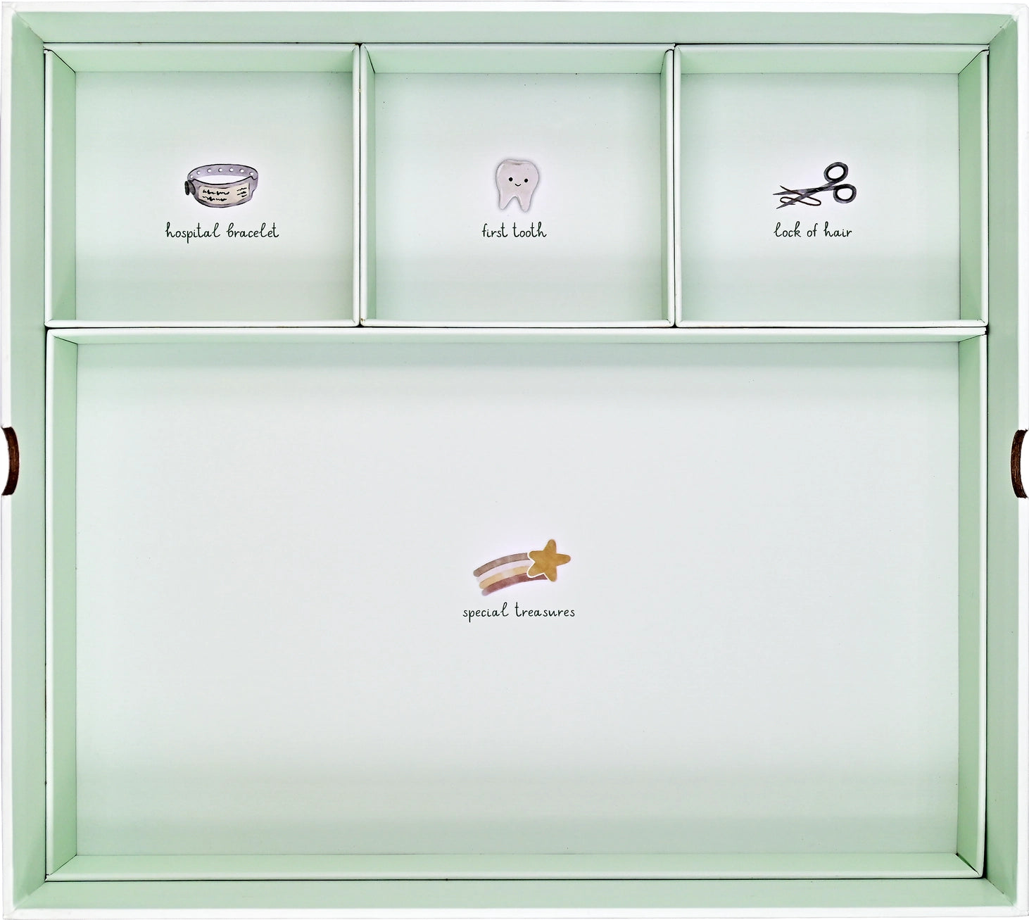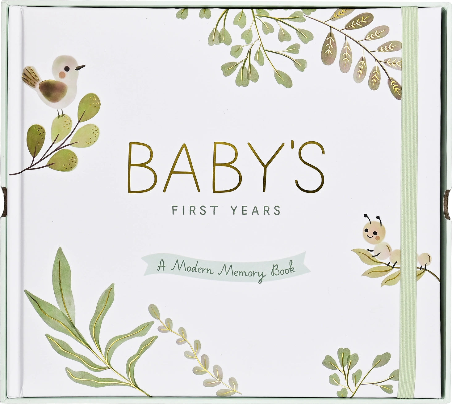 Capture Baby's first 5 years with this deluxe set! Includes a baby book, a keepsake box, a handprint/footprint ink pad, and milestone stickers! Memory Book is filled with prompts to help you preserve special moments and favorite photos! Pages are acid-free and of archival quality. 140 gsm paper takes pen beautifully. Padded cover is embellished with gold foil. Keepsake box is for storing Baby's hospital bracelet, lock of hair, cards, letters, and other mementos. The ink stamp kit will help you preserve Baby's handprints and footprints. Use the milestone stickers to mark memorable moments: Place stickers on Baby's clothes or near Baby and take a photo! Memory book has 112 pages and measures 10.125'' wide x 9.75'' high. Box measures 12-1/8'' wide x 10-3/4'' high x 3'' deep.