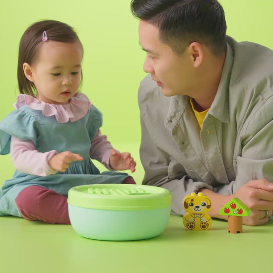 A fine motor skills toy with double the fun – The colorful brickscome in 4 different shapes, assemble to make a puppy play place or can be taken apart to drop thorough the lid of the doggy bowl