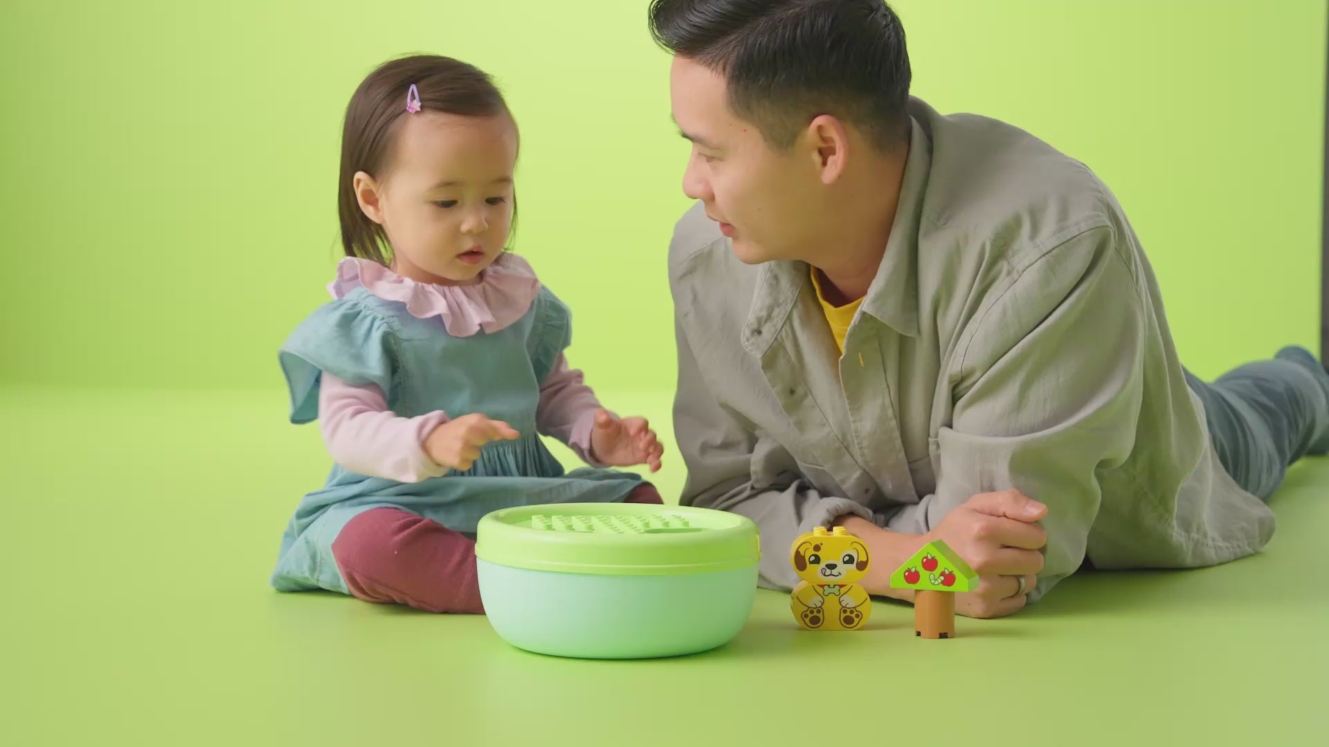 Learning activities for family fun – Parents introduce toddlers to interesting shapes as toddlers build them into dogs, trees and a house to create fun role-play stories for their cute toy pups
