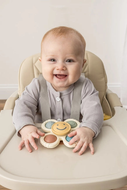 Fidget spinner with suction cup base and four silicone sensory poppers. Highchair toy format designed to entertain baby. Suction cup adheres to smooth surfaces, making for a colorful and engaging sensory toy. Helps build hand-eye coordination. Age grade 0m+
