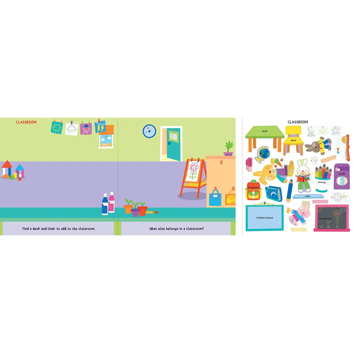 Each scene features a different setting or place: Bath Time, Park, Classroom, Kitchen, Bedroom, Winter, Autumn, Summer, and Spring! Youngsters can populate each scene with the related stickers provided, including animals, objects, and other embellishments.