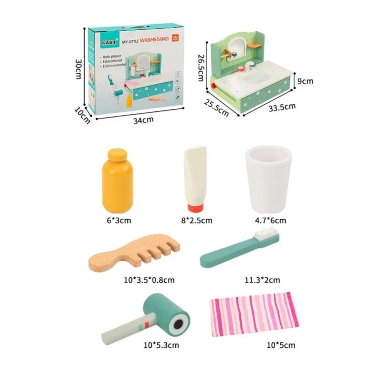 Made from high-quality, eco-friendly wood and designed with charming details, this miniature washstand encourages imaginative role play and supports everyday routine learning. A fun and educational way to introduce self-care habits and life skills through hands-on play.