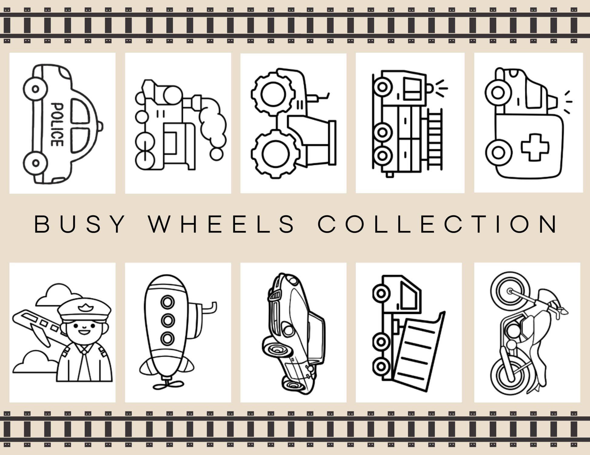 10 Action-Packed Vehicle Prints – Featuring fun scenes with cars, trucks, buses, and other busy wheels, printed on high-quality watercolor paper.