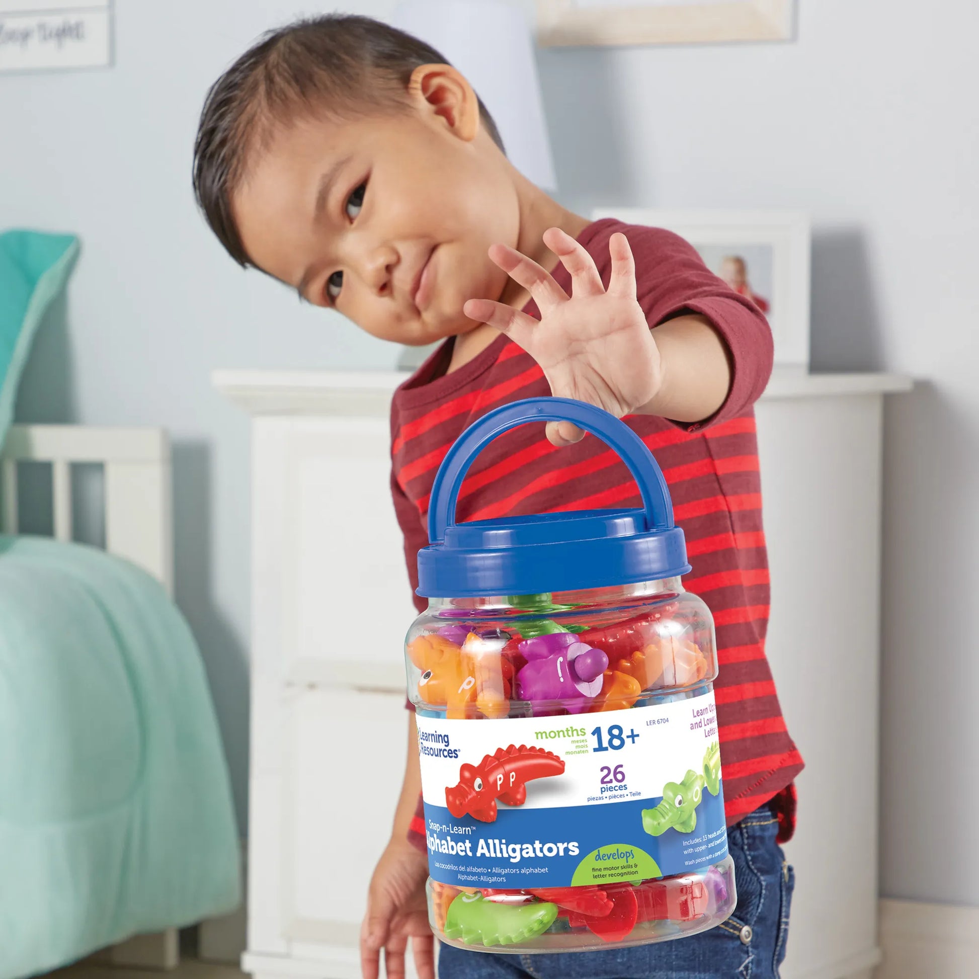 Reinforce shape and color recognition with these two-piece alligators. They easily snap together and pull apart to develop fine motor skills and teach matching. Plastic pieces wipe clean with a damp cloth and includes a resealable plastic storage bucket. 26 pieces! For ages 18 months and above.