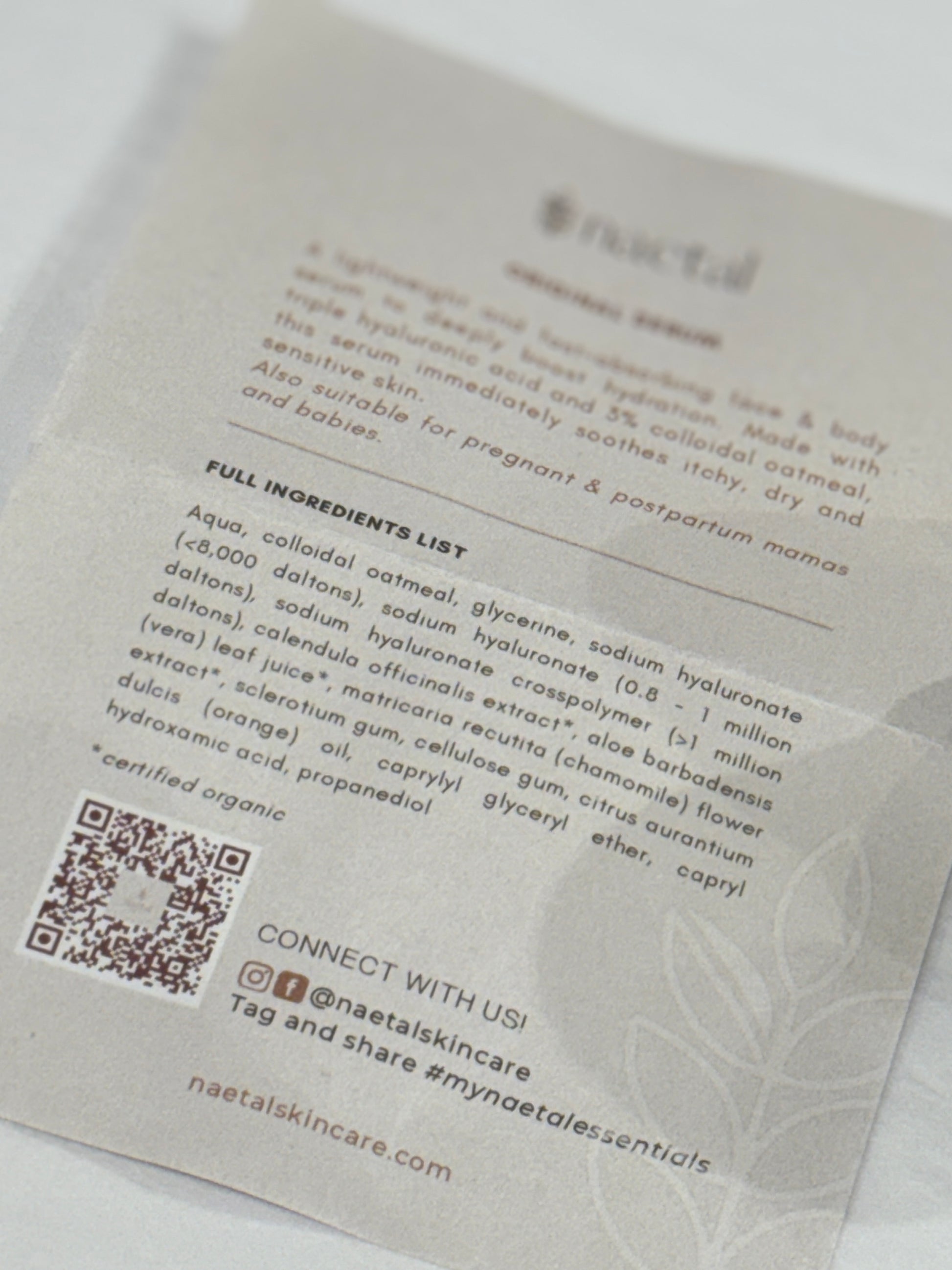 ORIGINAL SERUM - Aqua, colloidal oatmeal, glycerine, sodium hyaluronate (<8,000 daltons), sodium hyaluronate (0.8 - 1 million daltons), sodium hyaluronate crosspolymer (>1 million daltons), calendula officinalis extract*, aloe barbadensis (vera) leaf juice*, matricaria recutita (chamomile) flower extract*, sclerotium gum, cellulose gum, citrus aurantium dulcis (orange) oil, caprylyl glyceryl ether, capryl hydroxamic acid, propanediol