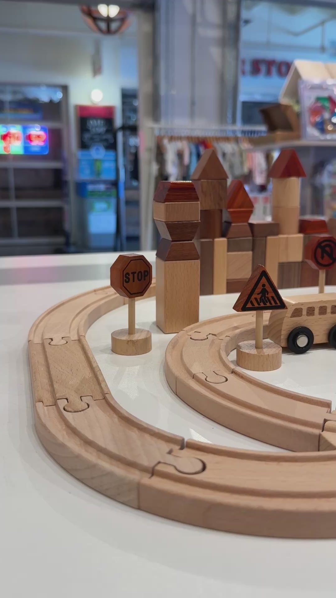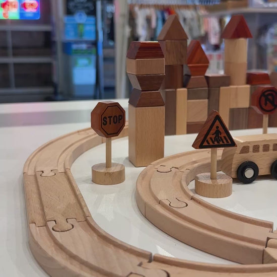 - 50+ pieces including train, bus, track, signs, and building blocks.